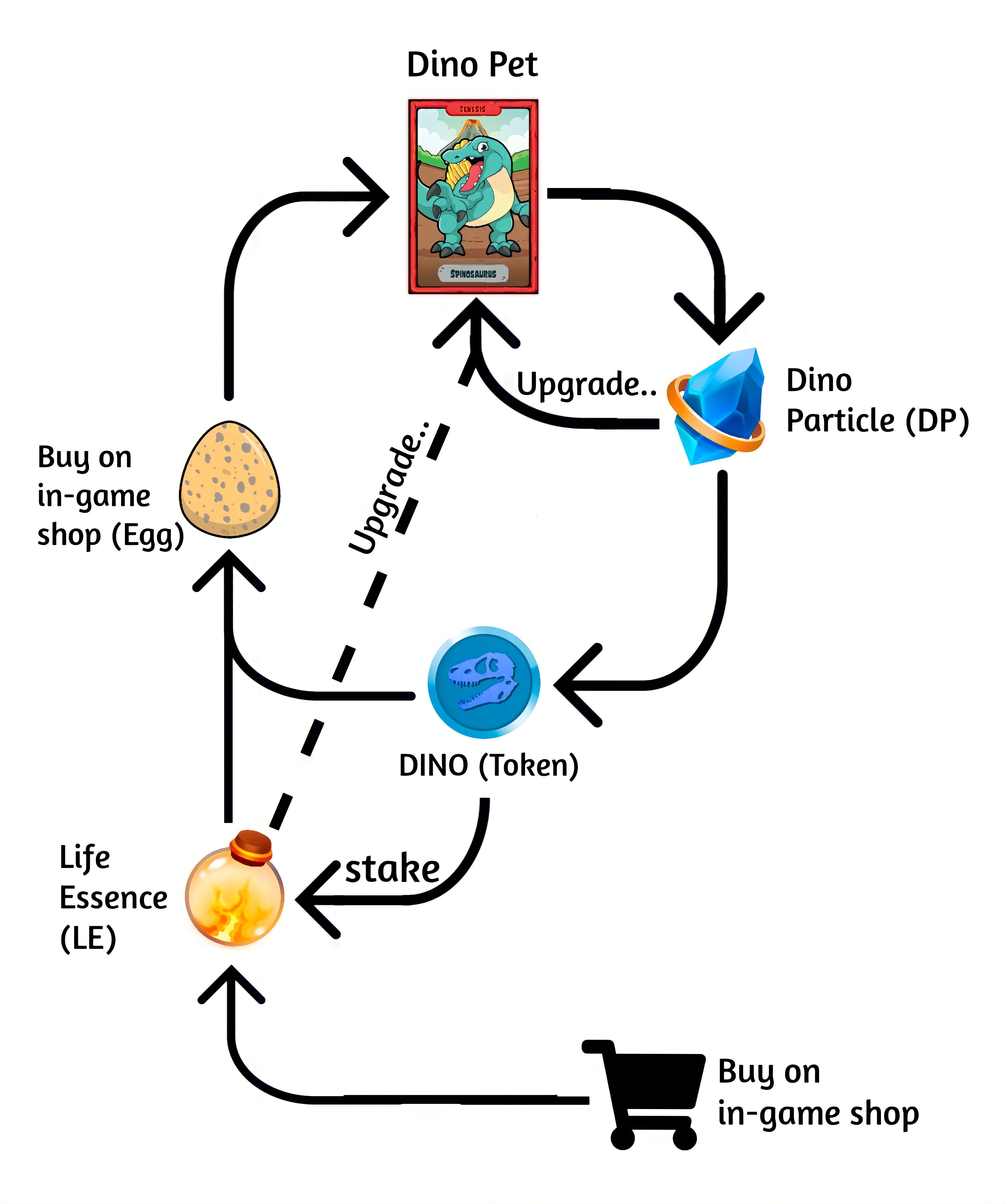 Let us start with the basic Step . First Players have to Purchase the Dino Egg from the in-game shop using Dino Token and Life Essence token. After that Players Will hatch those Dino eggs to get the Dino Pets . There will be Specific Dino Particle of Each Type of Dino Pets according to that players can collect reward from the pool . After that Using those Dino Particle Tokens User can Choose Either to upgrade Their Dino Pets from a Level 0 Dino to a Level 100 Dino (**As Per their Choice** ).\
